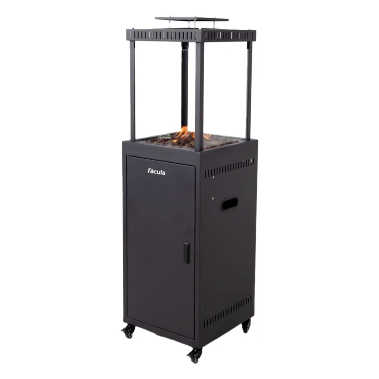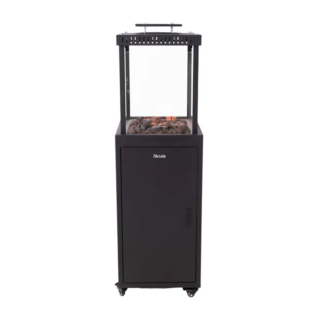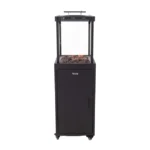 Estufa de gas exterior negra de 9kW con piedra volcánica.
